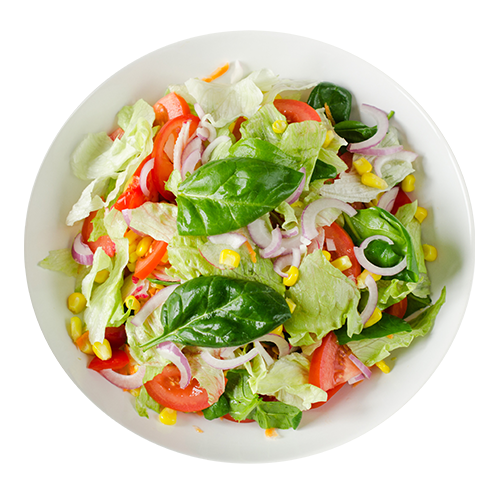 Gemengde salade, tomaat, verse uien en spek