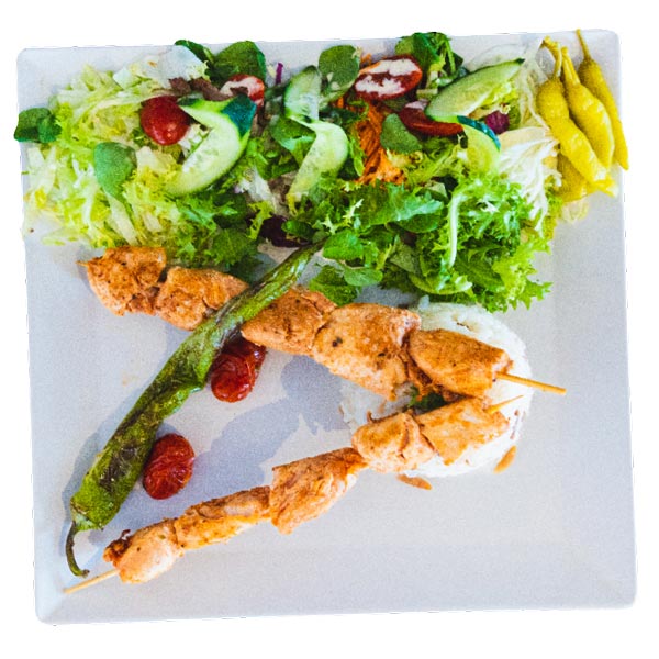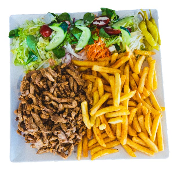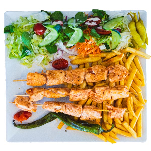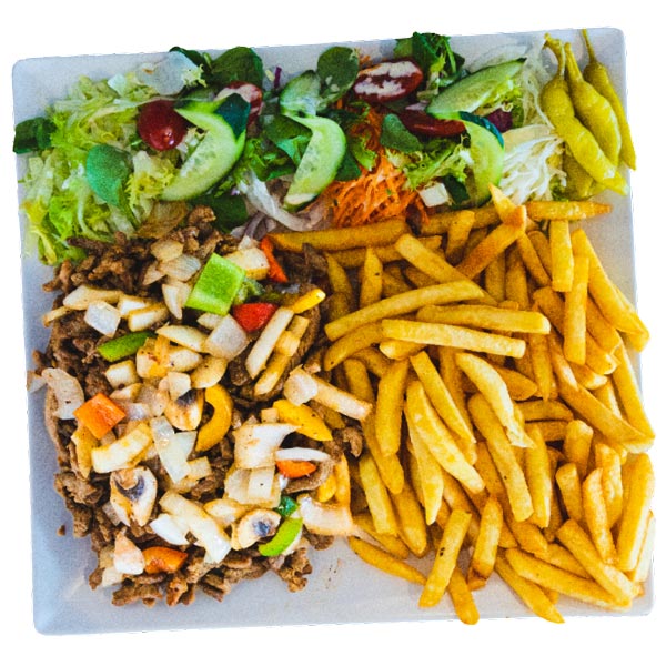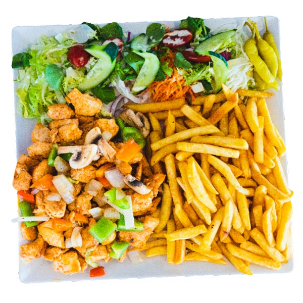 Alle schotels worden geserveerd met salade, friet of rijst en saus